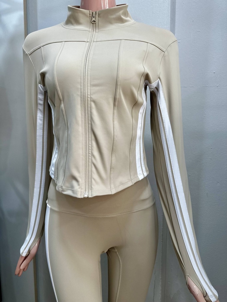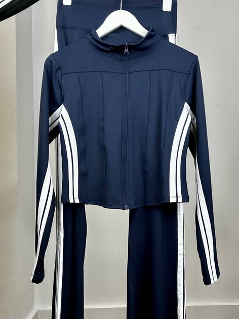 Conjnto de dos piezas mayas ligeramentes acampanadas y chaqueta con abertura para el pulgar. ( Esta caracteristíca se utiliza para mantener las mangas en su lugar durante el ejercicio )Tejido comodo y elástico para facilitar el movimiento.