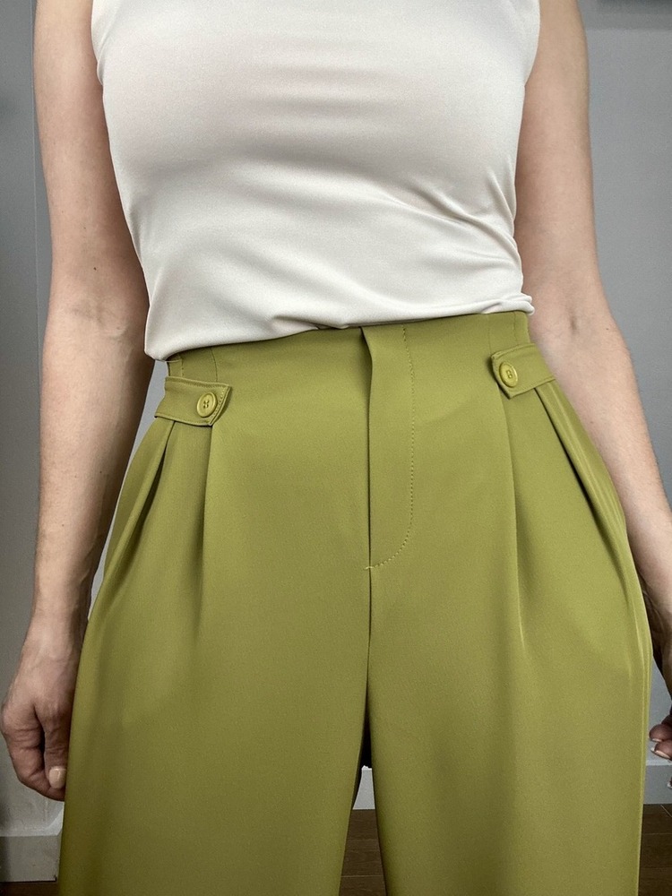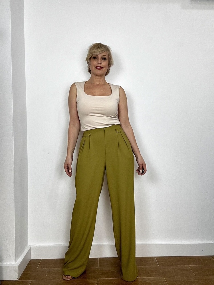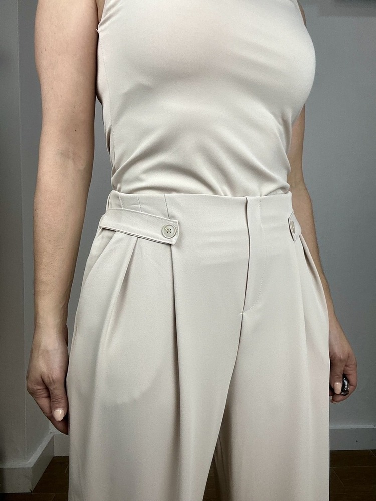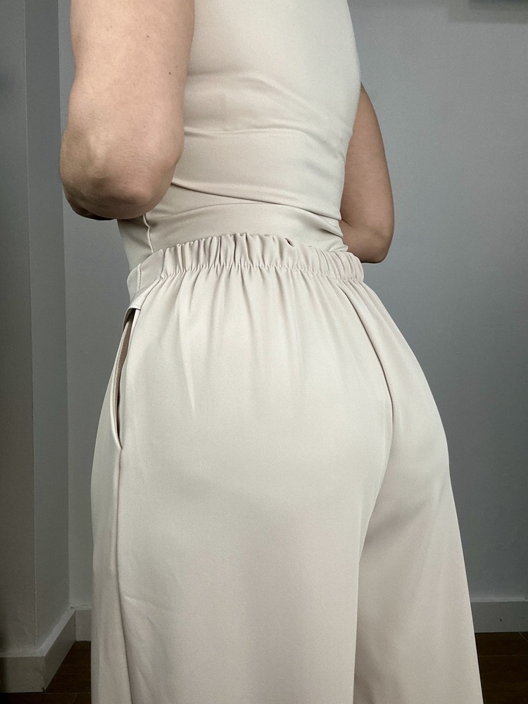 Tejido crepé. No tiene cremallera ni botón de cierre. Cinturilla elástica en la parte de atras.